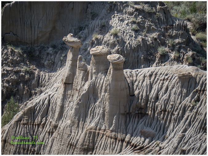 With the continuing erosion, colored layers of rock are exposed. They consist of layers of poorly lithified siltstone, claystone, sandstone, and lignite coal that were deposited in a coastal plain environment. When we looked around, common sedimentary sandstone was mostly what we see. But a closer look showed odd shapes and strange formations that we learned result from weathered sandstone that forms a protective cap of rock in some places called “hoodoos.”