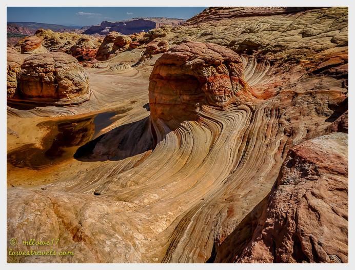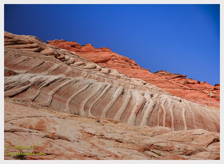 The Wave is actually a small ravine between eroded sandstone domes formed of amazing rocks containing thin, swirling strata. It’s situated at the foot of the north slopes of Top Rock, formed of white Navajo sandstone. It’s hard to imagine that billions of years ago the area was flat and covered with sand. As usual, wind and water eroded, carved and smoothed to reveal the layers of sand remaining. Finally, those layers were compacted and mineralized to reveal what we see. Amazing!