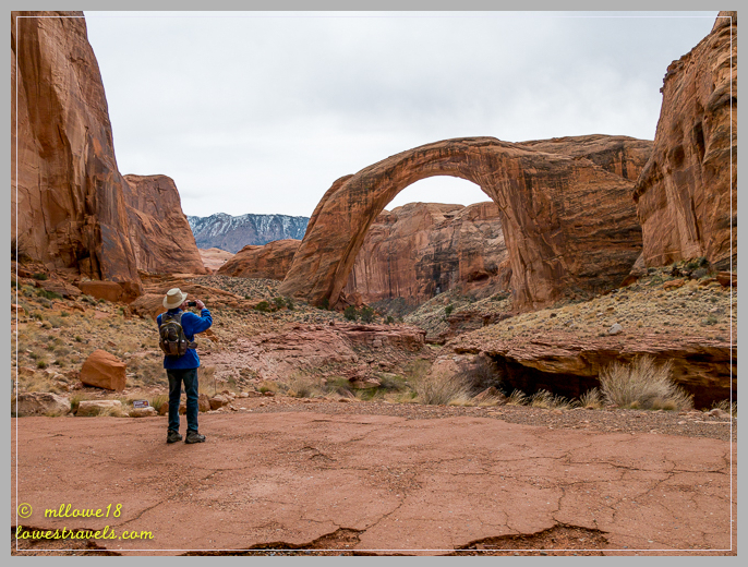 Filled with anticipation, we finally rounded a bend and saw part of the bridge soaring in a huge arc. At that moment we understood why it is named Rainbow Bridge. It looked just like a rainbow carved into the Navajo Sandstone, with 10,000’+ snow-dusted Navajo Mountain in the background.