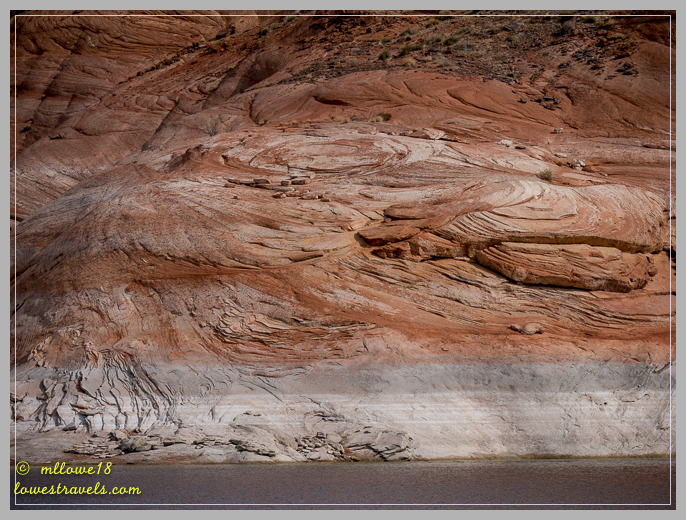 As the boat cruised along 50 miles of beautiful Lake Powell, we were immediately awestruck with the canyon scenery. It was a narrated tour that included information about local geology. We gazed at countless soaring red rock cliffs, solitary buttes, mesas and orange beaches that we had only glimpsed during our hike of the Page Rimview Trail a few days previously. Although the glens (lush and green growth along the river and side canyons) for which the canyon was named are now deep beneath the lake, the formations that remain above the surface of the water create a truly spectacular scenery.