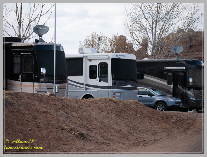 John and Pam’s coach on the left, then Beluga and finally Betsy lined up at Cadillac Ranch RV Park