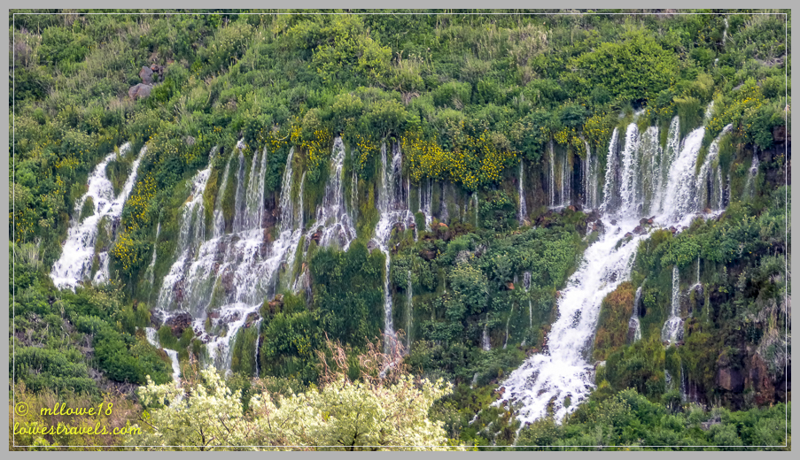 It was along Thousand Springs Scenic Byway from Hagerman up north to Twin Falls that we saw dozens of these springs/waterfalls surging over the canyon walls.  We also noticed a mix of geological features resulting from the Bonneville Flood, along with miles of beautiful rural farmland.  It actually was kind of magical!