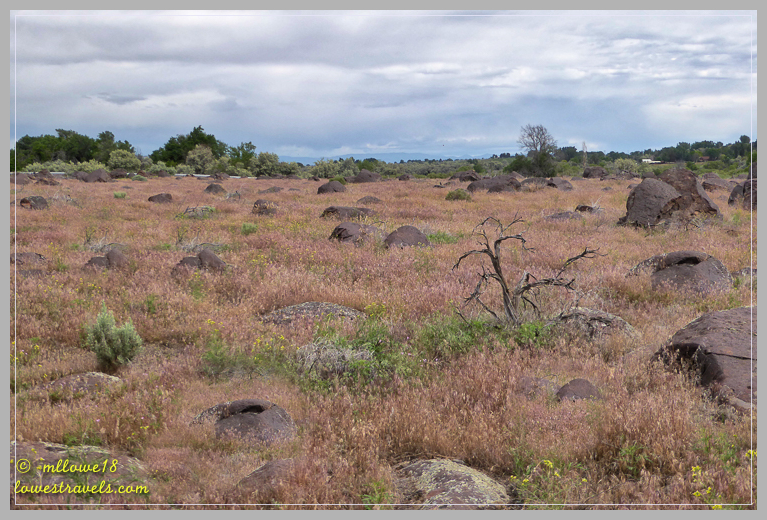 These partly rounded basalt boulders were deposited in Hagerman after bouncing along the Snake River during the Bonneville Flood.  They’re called Melon Gravels