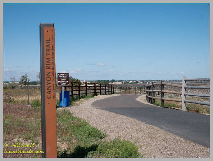 We did it in two walks; first going east from the visitor center to Evel Knievel’s historic jump site, and on another day walking from a parking lot to the west of the visitor center back to the bridge.  Then we walked both ways across the Perrine Bridge before visiting Centennial Park at the bottom of the canyon.