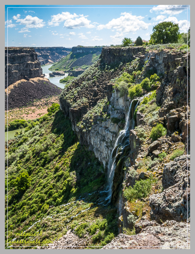 7. Love the photo of Steve cooling off behind the waterfalls and the picture of you with the rainbow overhead! Waterfalls are always amazing to see no matter how big or small. Thanks for the history about Twin Falls only being One Fall…cool fact for sure! The Niagara of the West is impressive. I’ve sure been enjoying your summer travels MonaLiza…happy trails! P.S. I have to touch the water too!