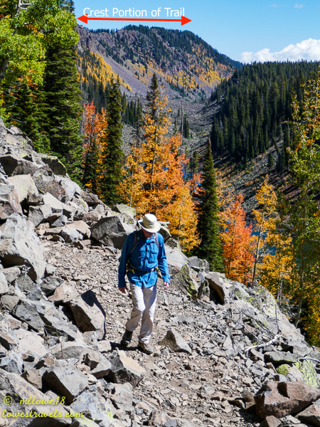For the next two miles, we walked a narrow ridge flanked by dizzying drop-offs on both sides, with spectacular vistas all around. Tall mountain ranges were visible to the south, with golden Aspens shining brightly from the mountaintops and hillsides.
