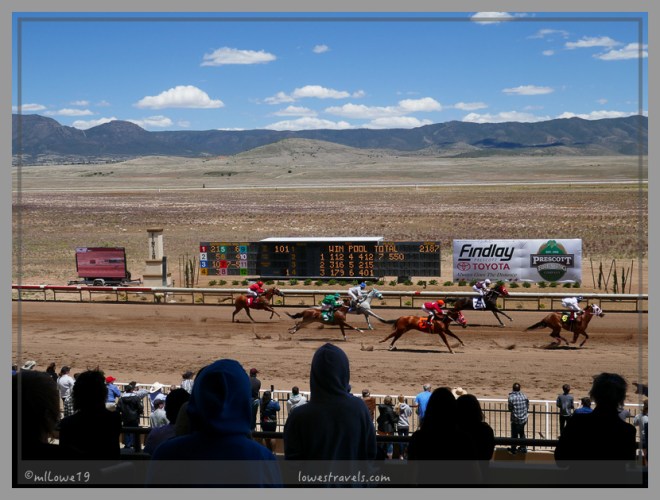 A 5-minute walk from Fairgrounds RV Park allowed us to check out some horse racing during our stay. Arizona Downs is a newly-reopened horse track in Prescott Valley, and the Memorial Holiday weekend happened to be their grand opening. We chose a windy day for our visit, since hiking in a dust storm didn’t appeal to us. We’re not horse-racing fans and didn’t bet, but for $2.00 each to get in it was fun to watch a 1-minute race after 45 minutes of track preparation: