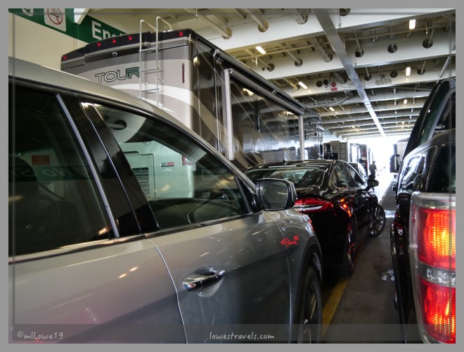 We left the campground super-early the next morning, filled both vehicles with the last “cheap” fuel we would get for a while, and fell in line for our ferry ride. The fee for this ferry was based on the total length of Betsy with the car attached, 59′. The trip back to Port Angeles will be based on the size of each vehicle separately, so the ferry companies here have their own way of charging. This was Betsy’s 6th ferry ride, so she’s familiar with this mode of transportation and being in tight quarters with other vehicles big and small:
