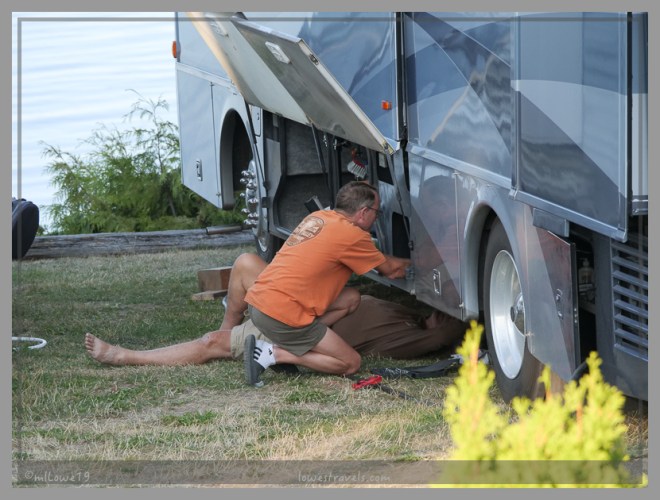 We also noticed that the left front leveling jack had retracted extremely slowly when leaving our last stop. Steve lubricates the jacks frequently, but on this stop he crawled under Betsy and thoroughly cleaned all of the jack seals and lubricated the rams again. They seem to be working fine so far – whew!