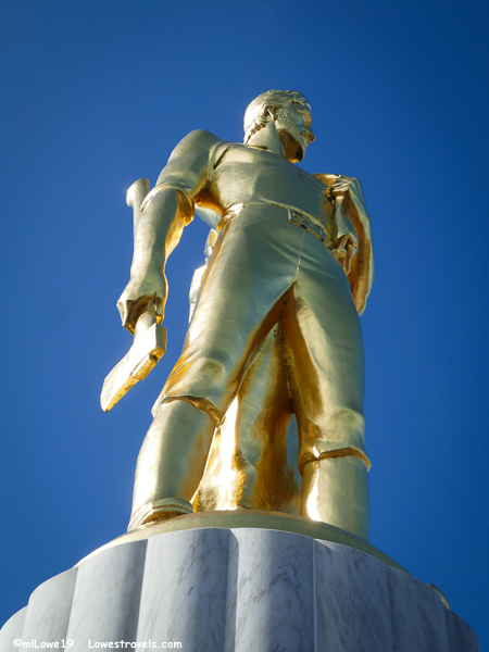 So off we went to Salem, just a half hour south of our campground at Pheasant Ridge RV Park, to catch the first guided tour of the day – the Tower Tour. After warming our legs on the 121 steep stairs to the observation deck, we looked up to gawk at the 23′ tall bronze Oregon Pioneer. The most eye-catching feature of this building, it’s gilded with gold leaf and symbolizes early Euro-American settlers.