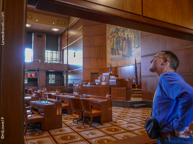 Afterward we joined a regular building tour and noticed the structure has simple adornment, rather than monumental staircases or grand columns or intricate ornamentation like many others we’ve visited. Completed in 1938, the Art Deco-style structure carries the inspiration of the undaunted pioneers who were the beginnings of Oregon. Its heritage is reflected throughout: