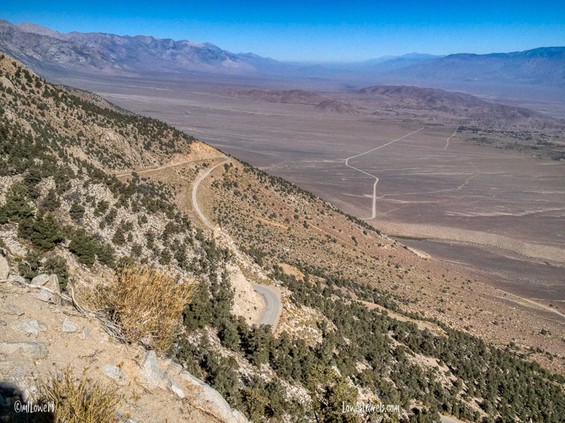The Horseshoe Meadow area is a popular entry point into Inyo National Forest and Sequoia National Park, with plenty of camping/picnicking opportunities. Getting there is an adventure in itself, with a 6,000′ elevation gain through many switchbacks as you drive up from Lone Pine. We stopped several times to enjoy panoramic views of Owens Valley, our RV park, mostly dried-up Owens Lake and the Inyo Mountains to the east. The Alabama Hills looked pretty small from way up here!