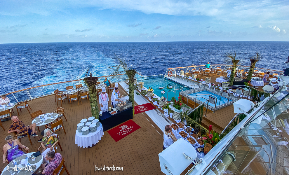 The night we left Bora Bora there was a French Polynesian celebration, where we were encouraged to dress up in Polynesian attire. The executive chef had set up a wonderful spread of culinary delights, and the ship’s officers and staff were grilling and handing out tons of delicious food. But the star of the party was displayed at the center, a huge Moonfish! We had never seen one before, and the best part was that we got to taste it, too. It was yummy!