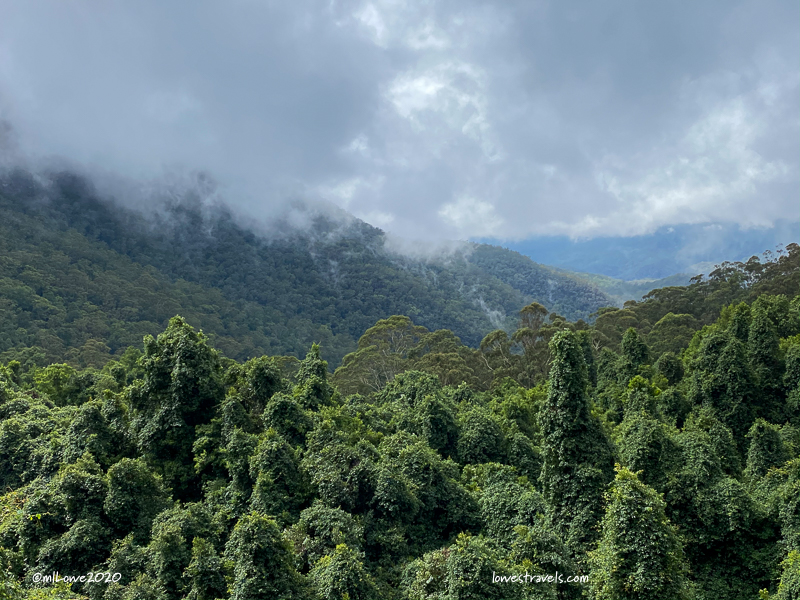 Our first stop was at an overlook where we were supposed to see the Three Sisters Rocks formation, which is famous here. Unfortunately, low clouds and fog completely obliterated the view and we saw nothing. So on we went to the scenic skyway, which ended up being a non-scenic ride through a thick cloud. After that, things started clearing up slightly and the steep railway ride and walk through the forest were quite enjoyable.