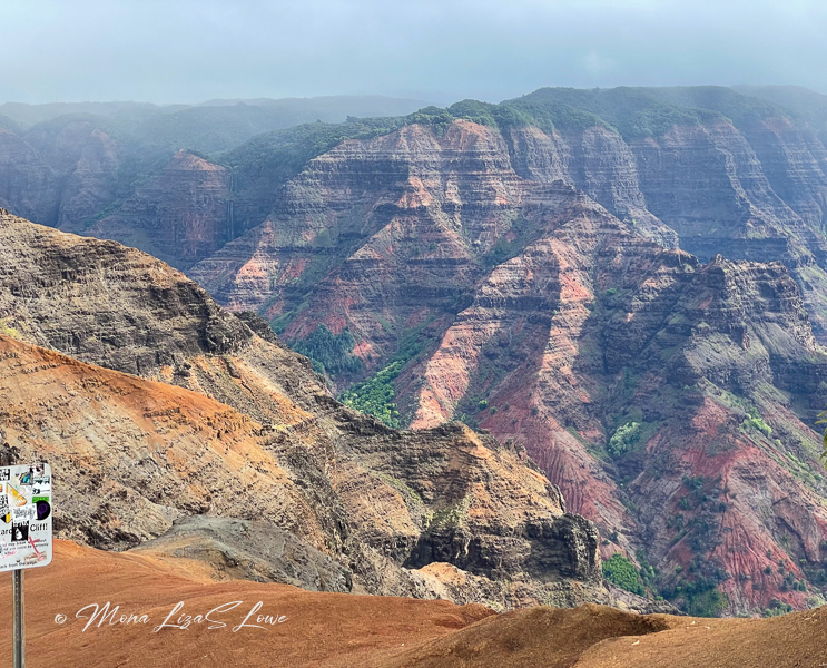 Waimea Canyon and Koke’e State Park are practically in Leah’s back yard, so they were our first outing. The drive on the scenic route took us above 3,000′ and it was nice and cool there. It was exciting to get up close to what we had seen from the helicopter and actually touch the red dirt: