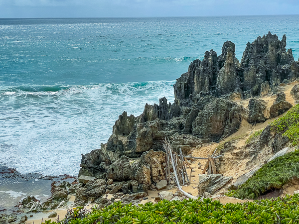 We walked the coastal Maha’ulepu Heritage Trail that began at Shipwreck Beach near the Grand Hyatt in Keoneloa Bay. It led us to what looked like an alien landscape. The rock formations were created over thousands of years from sand dunes weathered by crashing wave action, and carved sharp ridges with deep pockets were the result. The scientific explanation is fascinating, in that lithification occurred when sediments compacted, filling pores with ground water containing high levels of minerals. It all translates to spectacular and unusual formations like none we’ve seen before.