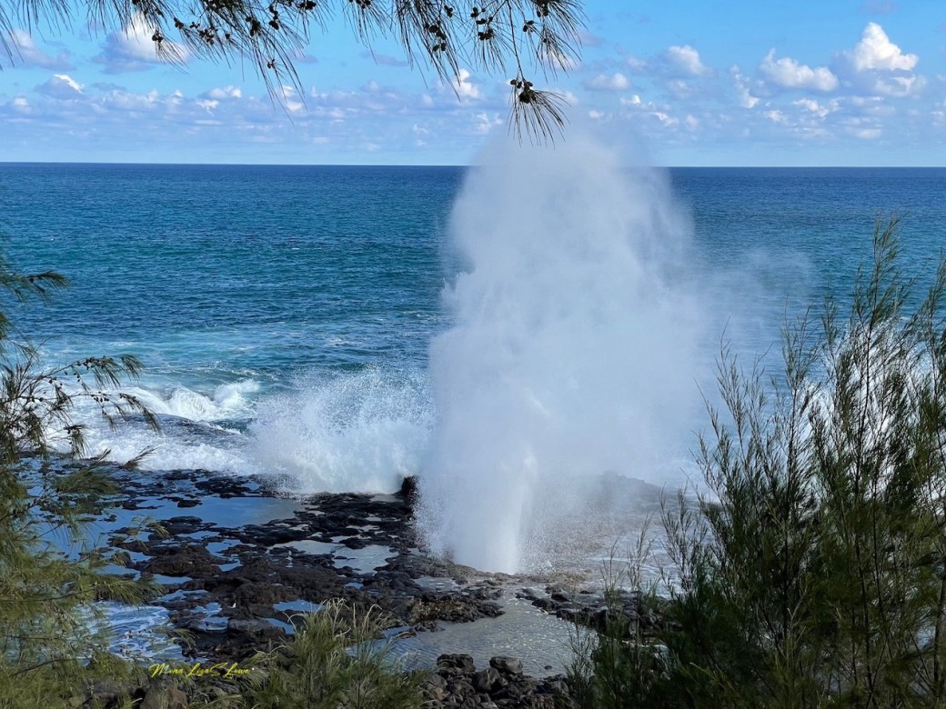 Just 5 minutes from our condo was another natural phenomenon, the Spouting Horn. The explanation was that it formed because of the repeated waves crashing onto the lava rocks and forming narrow openings in them. Every time a wave hits the rocks the water is forced into this narrow opening and shoots up into the air: