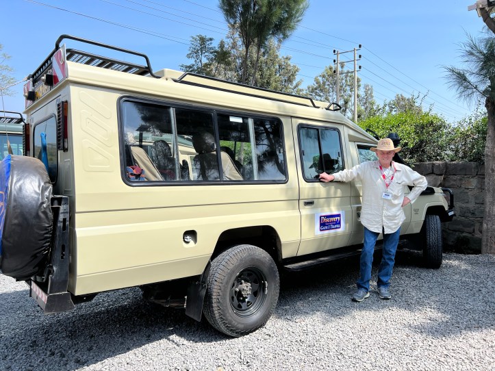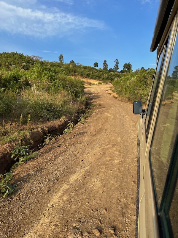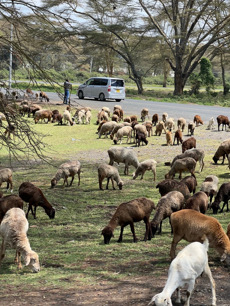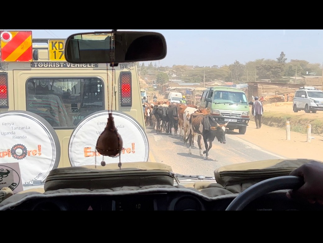 We headed out of Nairobi and our introduction to Kenyan driving began. As I mentioned previously, Kenyans drive on the left-hand side of the road in right-hand drive vehicles, and it took us a while to get used to it. We watched Benson skillfully navigate 2-way streets that morphed into 6-way roads in heavy traffic. Busses, motorcycles, vans and Safari jeeps all jockeyed to get ahead. Overtaking is more of a game of life on the road, and it’s nothing short of controlled chaos. After a while we decided not to look ahead, but instead to focus on the countryside scenery and grazing livestock along the roads: