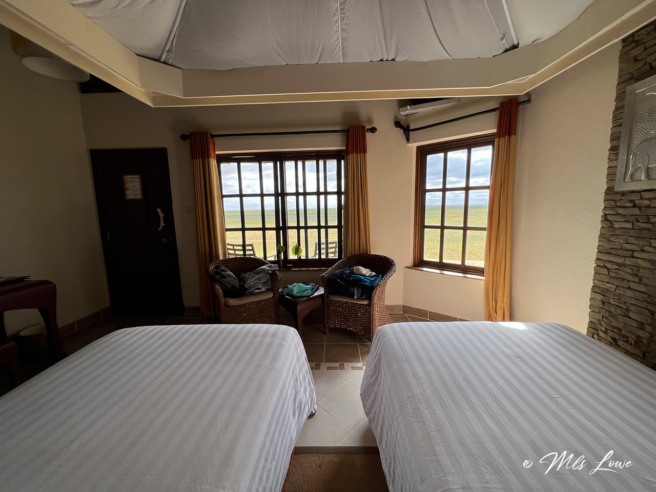 For the final part of our journey, we checked in at the Ol Tukai Lodge in Amboseli. This is where we would spend the final two nights of our odyssey. The rooms were okay, but not up to the plushness of our last stop. This lodge within the park has cottages with amazing views of the open plains where you can spot the amazing animals as they stroll by. It’s protected by an electric fence to keep them at a safe distance, but the local baboons and monkeys are free to play and wander around the property.