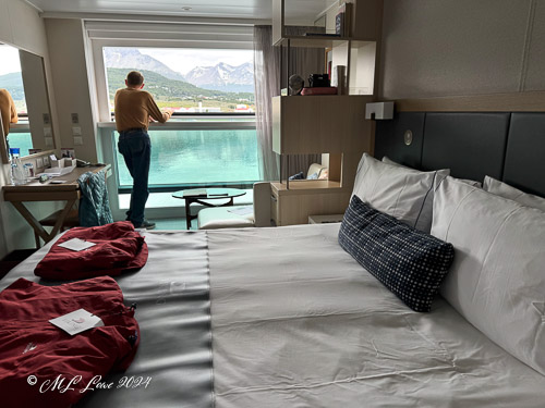We explored the ship to check out how different it is from the ocean vessels. The Viking Octantis expedition ship is smaller than the Viking ocean cruise ships. It is 665′ long, accommodates 378 guests and has 256 crew members. It was built focusing on remote destinations like the Arctic and Antarctica. It features a Nordic balcony instead of traditional stateroom balconies. The floor-to-ceiling distortion-free glass can be opened by lowering it for an al fresco lookout: